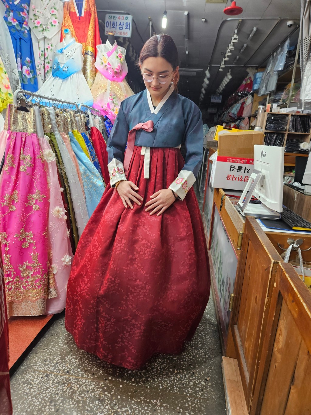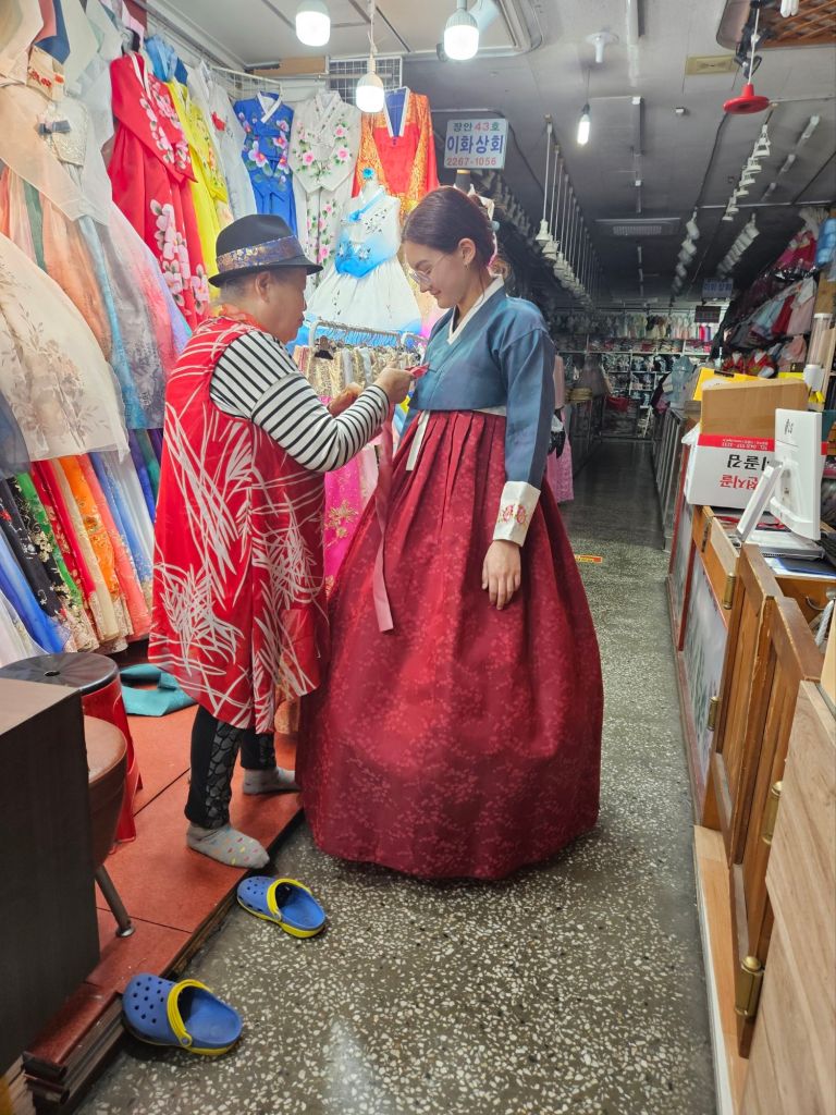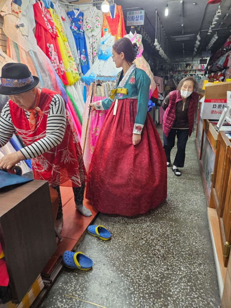 Having checked off most of our must-dos, we wander over to Gwangjang market JUST TO HAVE A LOOK. We have no intentions of buying anything. It’s Sunday, so while food stalls are open, most other vendors are closed. Except for hanbok merchants, as we quickly learn.